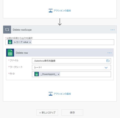 「Delete rowScope」では、登録完了したGoogle スプレッドシートの行を消す設定をします。