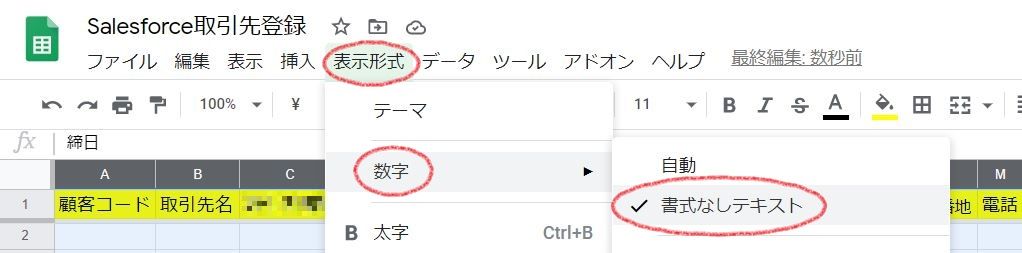 メニュー[表示形式]-[数字]-[書式なしテキスト]