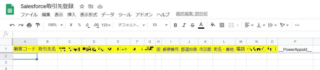 Salesforceに登録したいデータ項目を1行目に入力します。