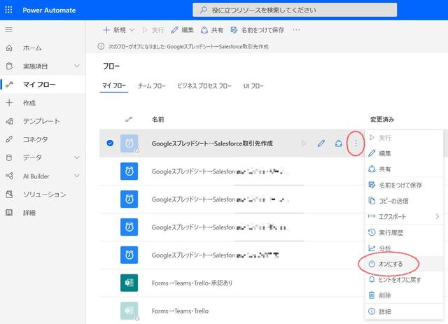 オンにすると、Power Automateが、Google スプレッドシートを定期的に監視し始めます。